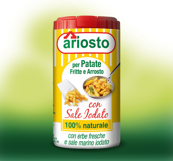La gamma di insaporitori Ariosto si completa con 4 varianti con Sale Iodato. Il sale iodato contribuisce al funzionamento della ghiandola tiroidea. I mix Ariosto con sale iodato non contengono esaltatori di sapidità e glutammato monosodico. Come tutti gli insaporitori Ariosto, anche questa linea non contiene conservanti, coloranti nè tracce di glutine. Ideale quindi anche per celiaci.